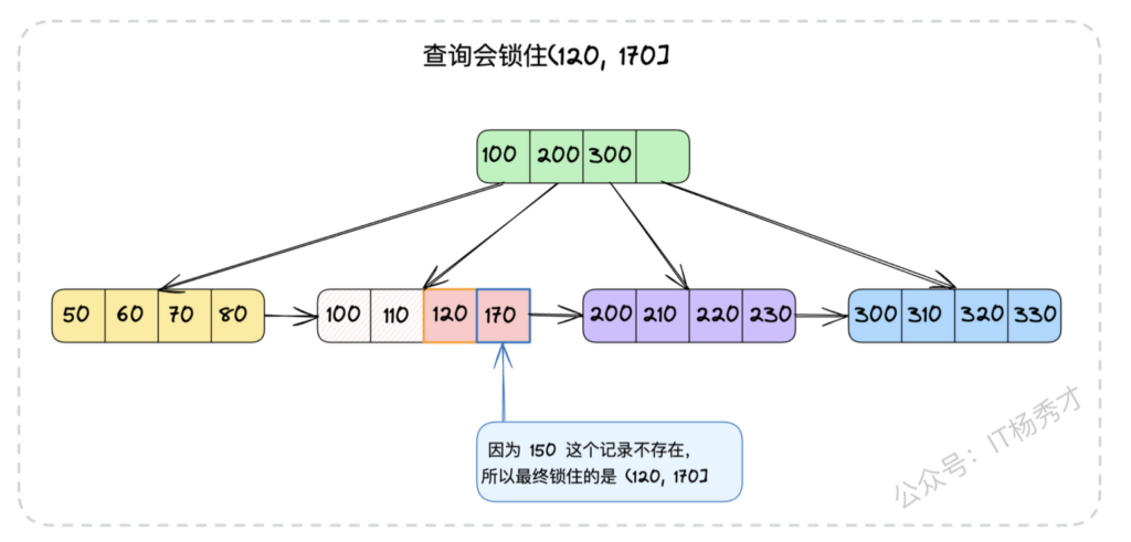 此时id=150这条记录不存在,锁会如何作用?InnoDB引擎会利用B+树索引的有序性,找到与150相邻的索引记录(例如120和170),并在这两条记录之间构建一个临键锁 (Next-Key Lock),其锁定的范围是(120, 170]。