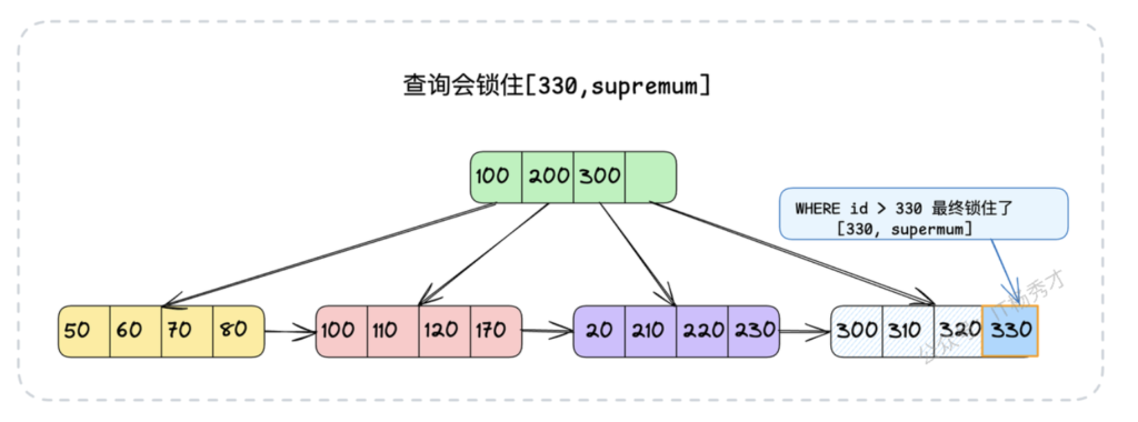 对于这条语句,InnoDB会构建一个覆盖范围为(330, supremum]的临键锁。这里的supremum你可以直观地理解为InnoDB内部定义的一个虚拟的最大值,代表正无穷。