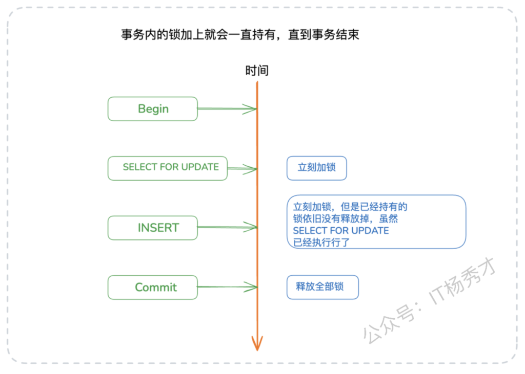 换言之,一个事务一旦给某份数据加上了锁,这把锁就会被一直持有,直到事务的终点。