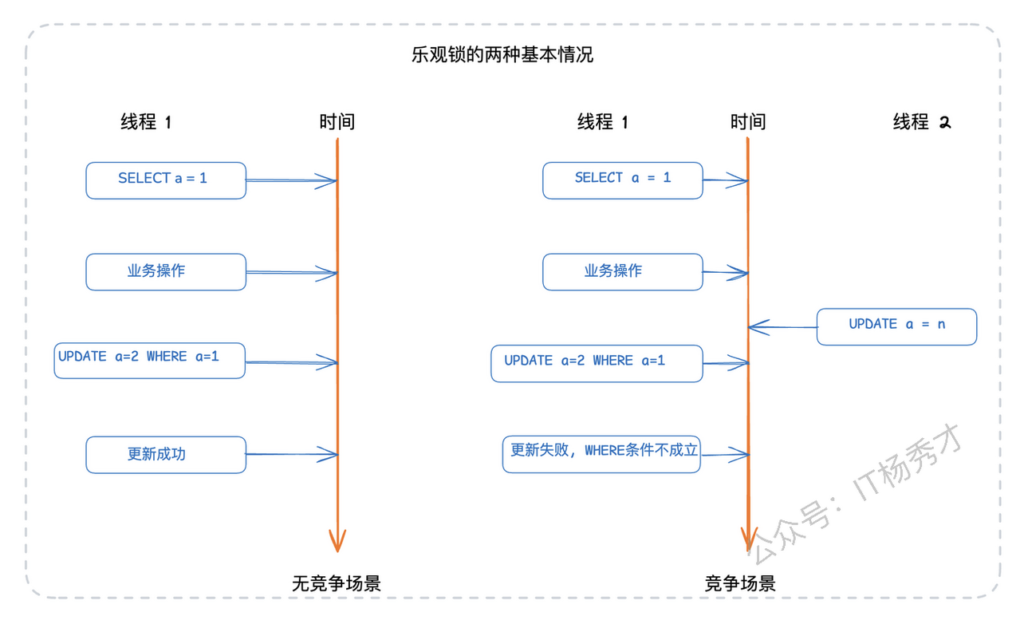 在上述UPDATE语句中,我们预期数据库中a的值仍然是我们最初读到的1。如果在我们进行业务操作期间,a的值被其他事务修改了,那么这条UPDATE语句的WHERE条件将不成立,更新操作就会失败(影响行数为0)。业务方通过判断受影响的行数,就能得知此次并发更新是否成功。