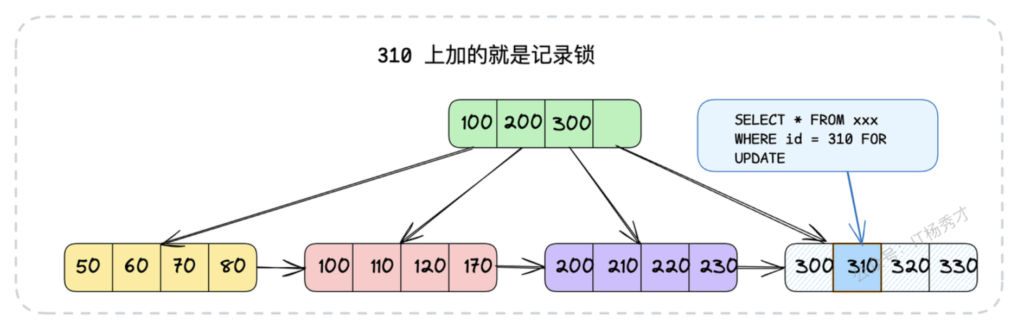 -- 假设id是主键,这条语句会对id=310这一条记录加上记录锁 SELECT * FROM your_tab WHERE id = 310 FOR UPDATE;