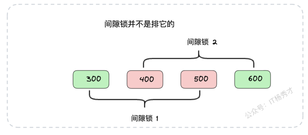 一个非常重要的特性是:间隙锁和间隙锁之间是不排它的。也就是说,两个不同的事务,即使它们申请的间隙锁范围有重叠,也可以同时加锁成功。