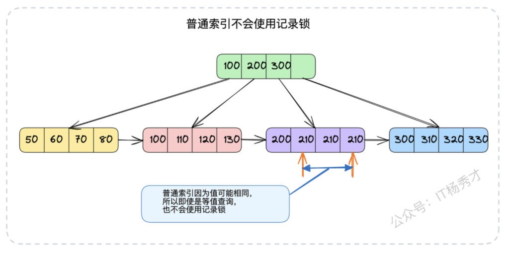 需要注意的是,对于普通索引,即使是等值查询,因为索引值可能重复,InnoDB为了防止幻读,仍然会使用临键锁,而不是退化为记录锁。