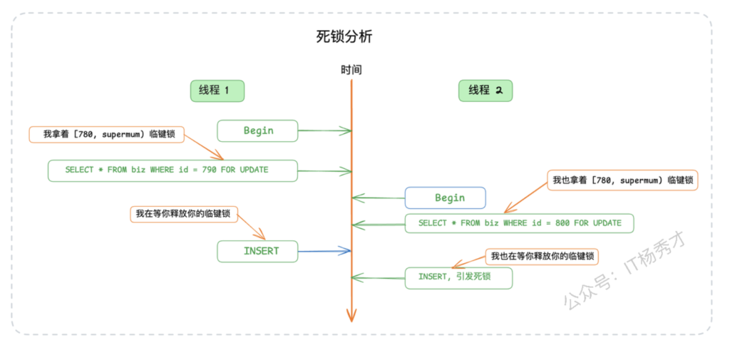 假设现在数据库中ID最大的值是780。那么如果两个业务线程几乎同时进来,执行这段逻辑,一个准备插入id=790的数据,一个准备插入id=800的数据。如果它们的执行时序如下图所示,那么你就会得到一个死锁错误。