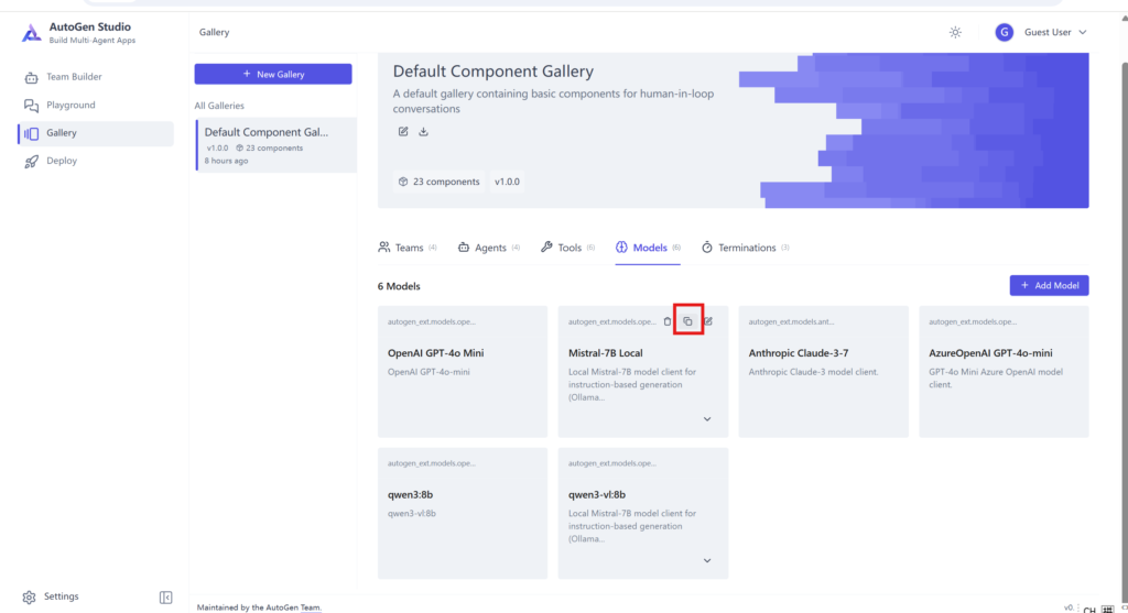 点击Gallery -> Models -> Add Model 按钮 添加本地模型,如果直接Add 新模型总出错的话,可以复制一个既存的非open ai的模型,然后再修改模型信息。