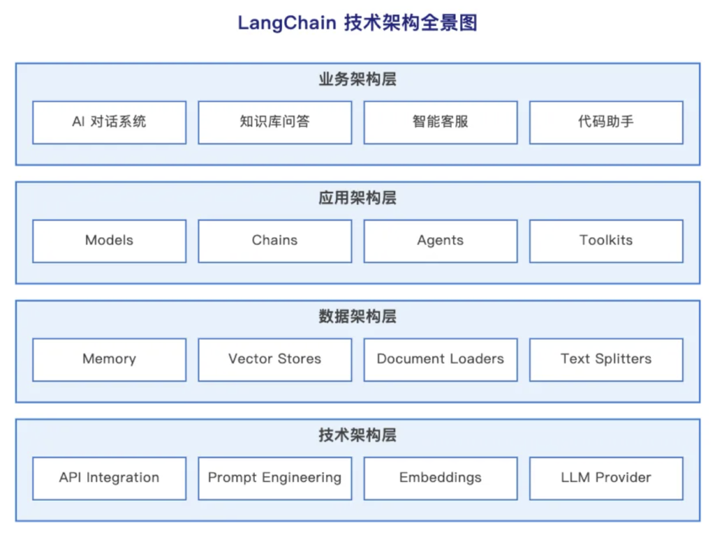- 数据架构层 – 包含 Memory(记忆管理)、Vector Stores(向量数据库)、Document Loaders(文档加载器)、Text Splitters(文本切割器)。重点是数据的流转和转换:原始文档如何变成 AI 能理解的向量?对话历史如何高效存储和检索?