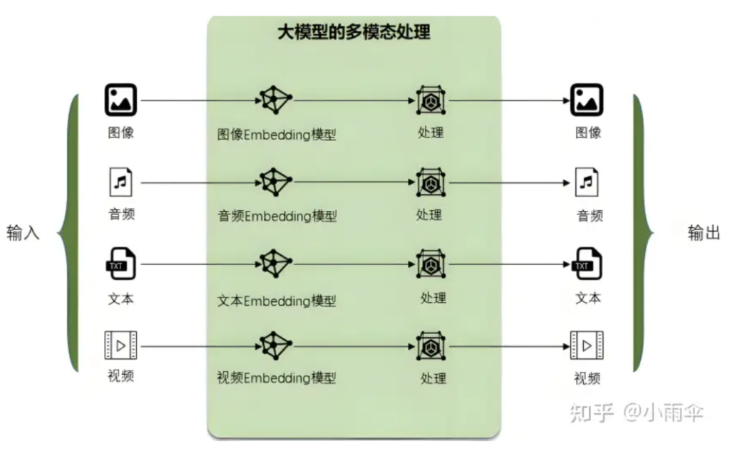Embedding就是大模型自己的语言,任何需要跟大模型沟通的文字、图像、视频都需要转换为大模型所能理解的语言:Embedding,它才能处理。处理完成后,它再翻译成人类能理解的文字、图像等。这也是大模型最强大的核心能力之一,多模态处理能力.