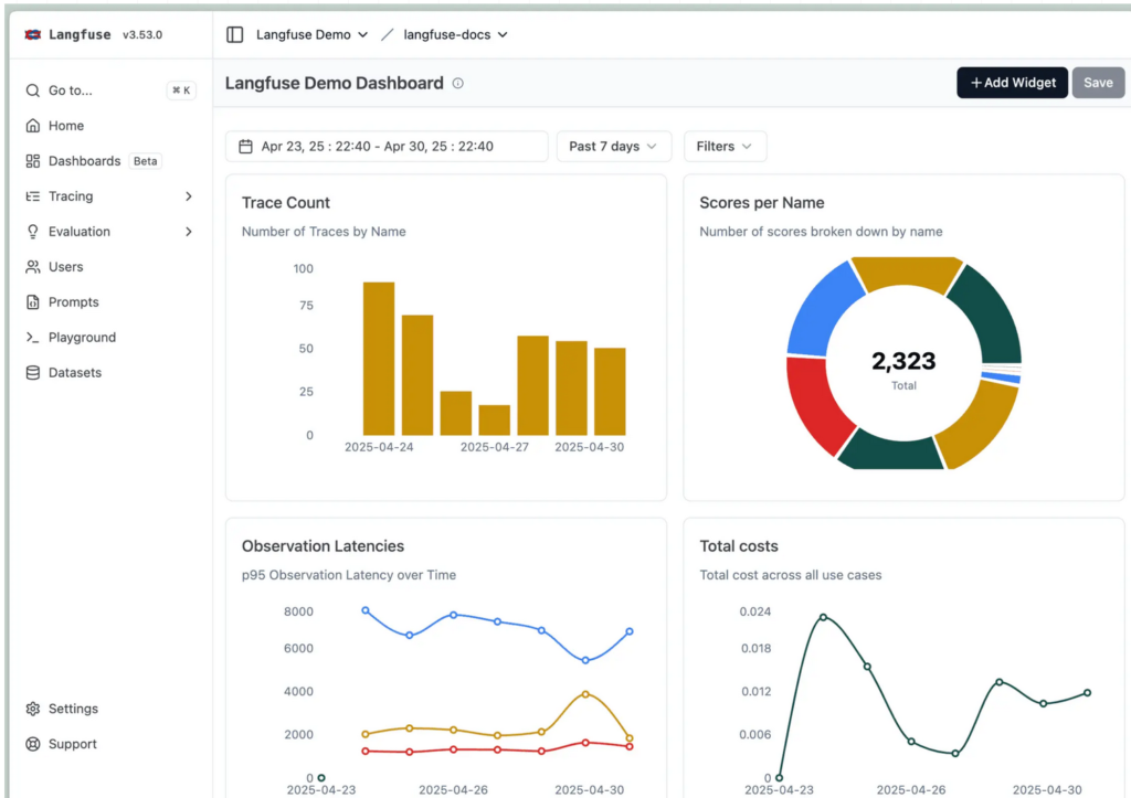 Langfuse允许实时监控成本和延迟指标,并按用户、会话、地理位置和模型版本进行分类。通过了解不同用户群体如何与AI互动,可以优先考虑改进方向,并识别个性化的机会。例如,可以为高频用户和普通用户制定不同的优化策略,以提供更优质的服务。
