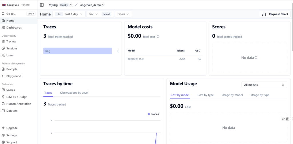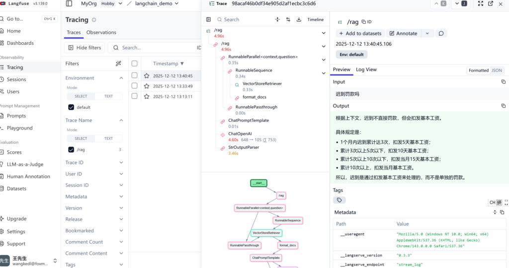 登录LangFuse网页可以看到细节被LangFuse监控到了。
