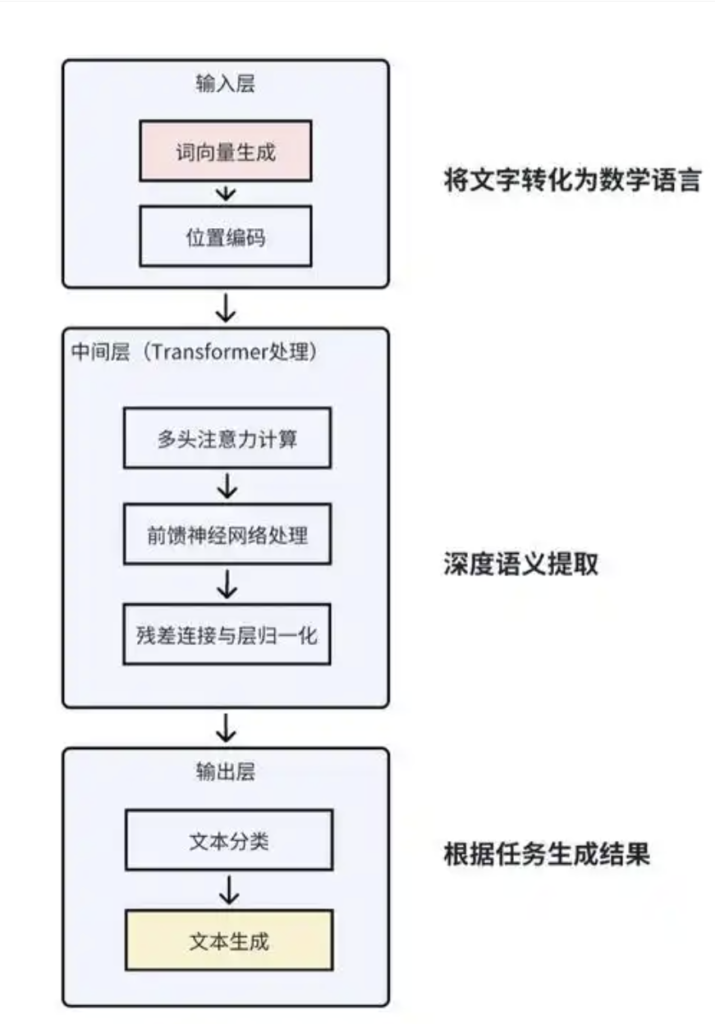 - 中间层的核心是 Transformer,主要的作用是对输入的数字序列进行深度语义分析,建立词与词之间的关联。