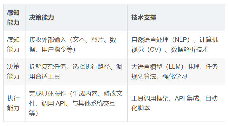 AI Agent 的学术定义是:一个能够感知环境、自主决策、执行任务,并通过反馈持续优化的智能体。通俗来讲,一个完整的 Agent 需要具备三大核心能力: