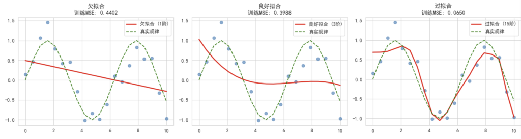欠拟合模型在训练集上的均方误差 (MSE): 0.4402 良好拟合模型在训练集上的均方误差 (MSE): 0.3988 过拟合模型在训练集上的均方误差 (MSE): 0.0650