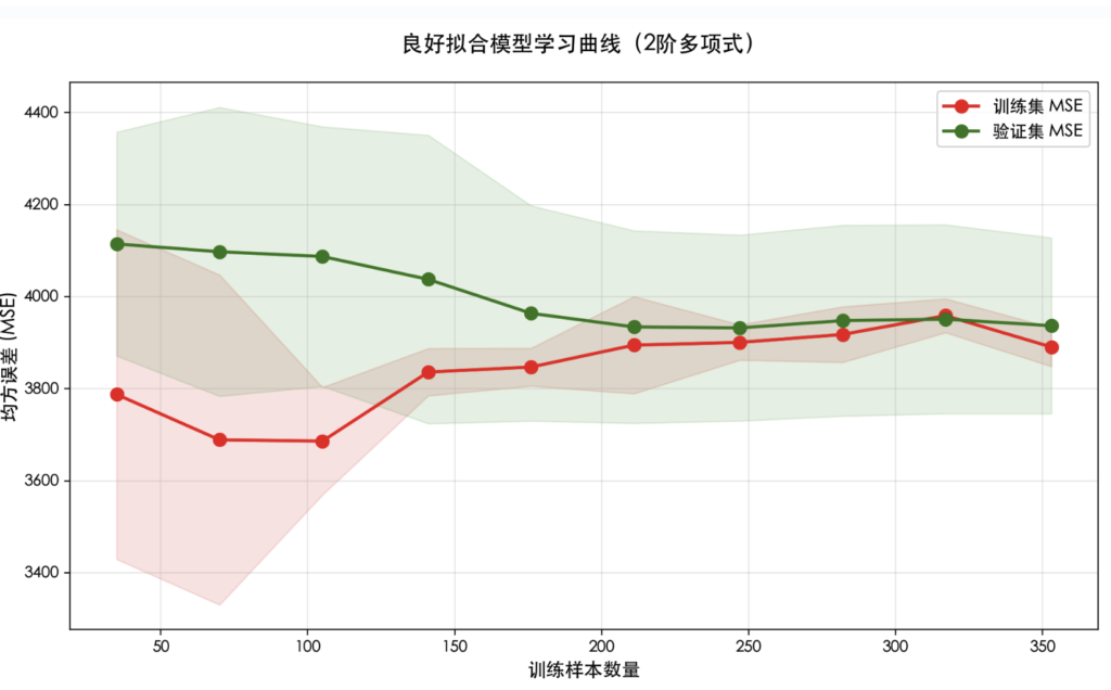 | 良好拟合 | 低 | 低 | 两条曲线都较低且彼此接近,达到一个平衡点。 |