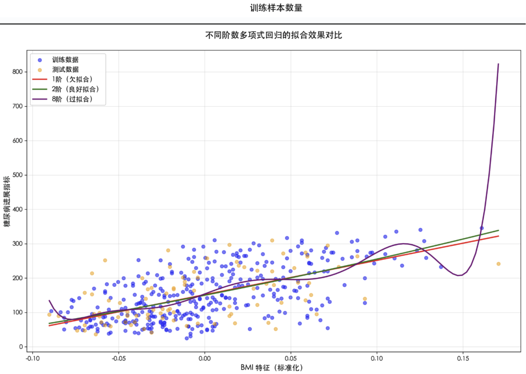 labels = ['1阶(欠拟合)', '2阶(良好拟合)', '8阶(过拟合)']