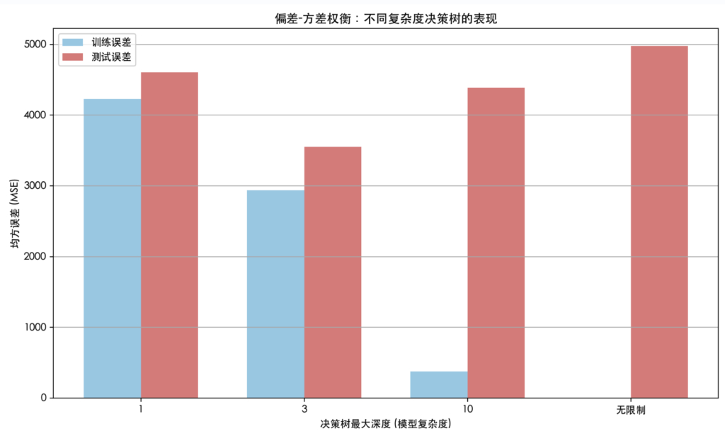 - 深度=10 或 无限制:模型非常复杂,训练误差极低,但测试误差开始上升(或远高于训练误差) -> 高方差,过拟合。