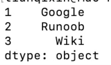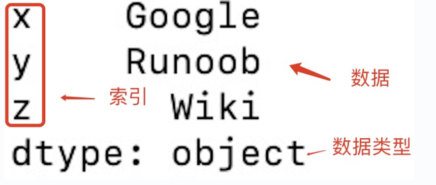 import pandas as pd a = ["Google", "Runoob", "Wiki"] myvar = pd.Series(a, index = ["x", "y", "z"]) print(myvar)