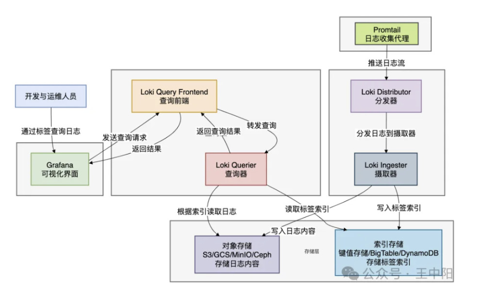 - • 长期归档:Loki + 对象存储,存储全量日志