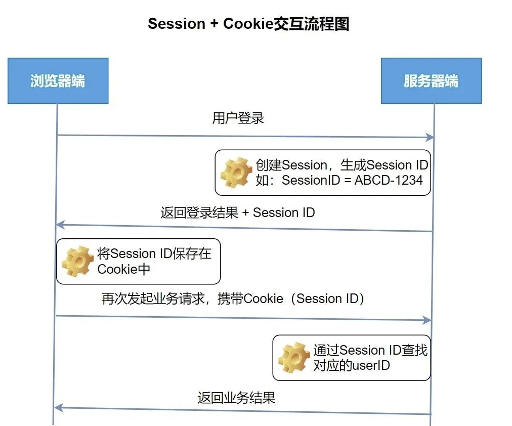 而Session + Cookie相结合的方式则是浏览器端的用户说“暗语”,服务器端以识别暗语的方式确认“用户是某某某”,这样就大幅提升了系统安全性的问题。我们可以看下Session + Cookie的详细交互流程。