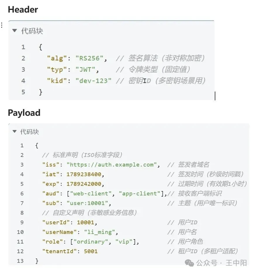 最后,咱们再聊一下JWT(JSON Web Token),是Token目前最流行的一种规范,包含Header、Payload(用户信息)和Signature(防伪签名)三个部分,以此来实现无状态身份验证。