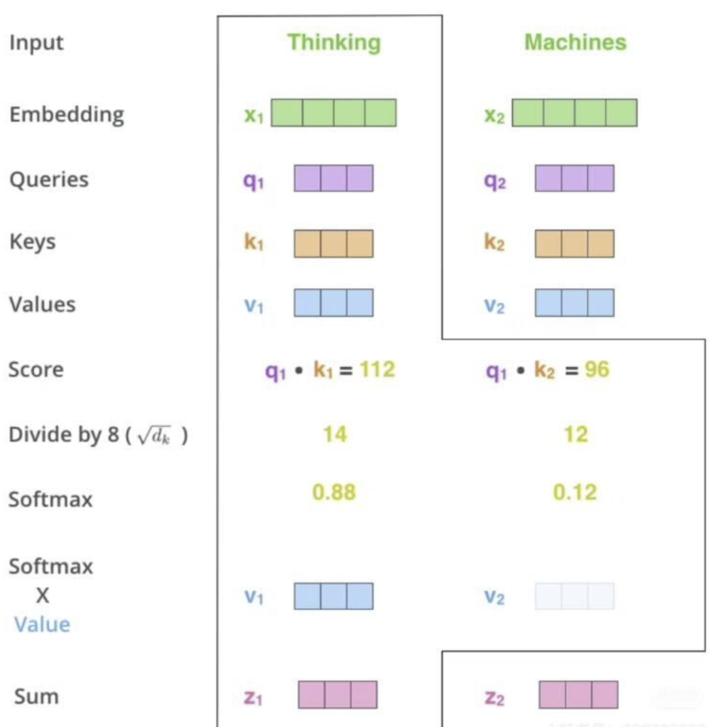 - 加权求和(信息汇总)最后,用上一步得到的注意力权重,去乘以每个词的Value 向量,然后把它们全部加起来。