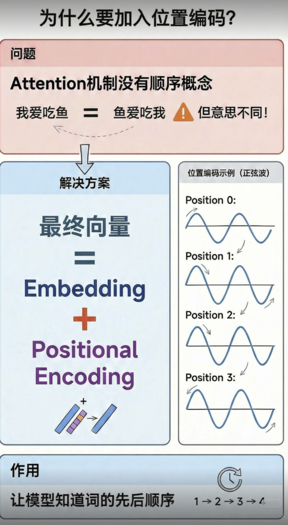 我们前面提到,Transformer 抛弃了 RNN 的循环结构,所有词都是并行处理的。这带来了一个新问题:模型不知道词的顺序了!“你爱我” 和 “我爱你” 在 Transformer 看来可能是一样的,因为它们都只是一个词的集合。