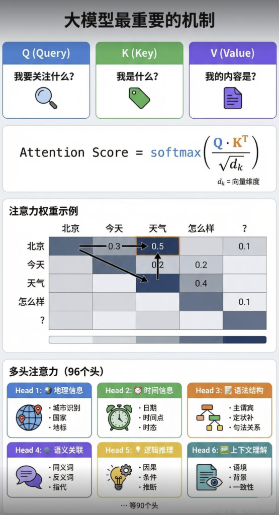 自注意力机制,允许模型在处理一个词的时候,能够同时、直接地注意到句子中任何一个其他词,并根据相关性的大小,赋予不同的 “注意力权重”。