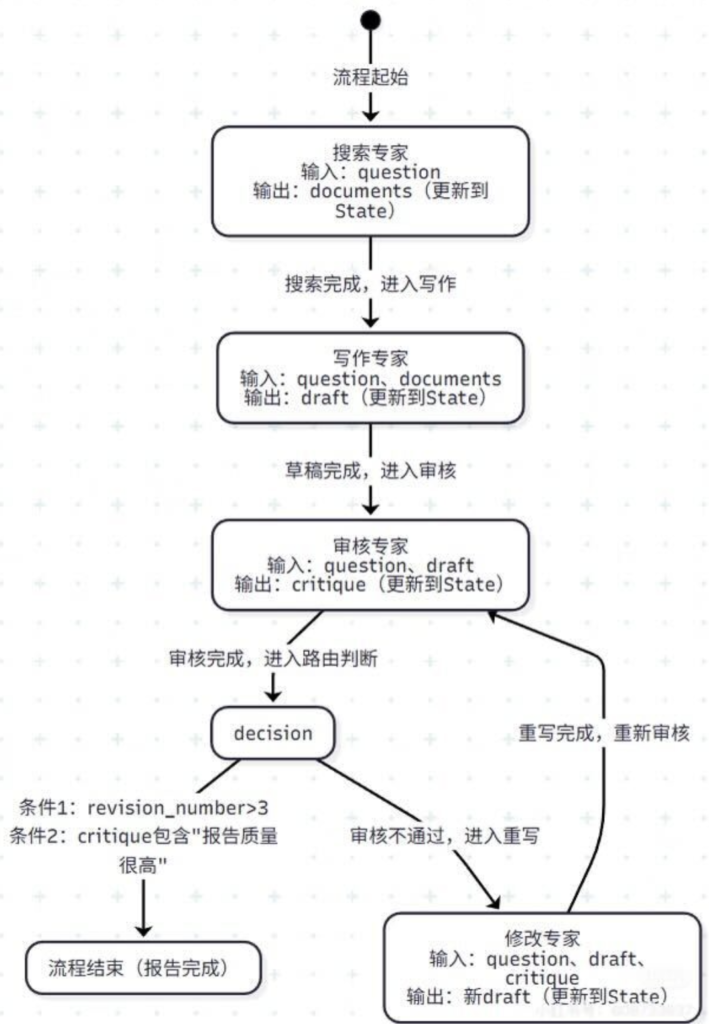 - 你可以在 “审核站” 设置一个 “交通警察”(条件边),它会根据你的报告质量,指挥你 “直行,去终点站”、“掉头,回写作站重写” 或者 “左转,去搜索站补充材料”。