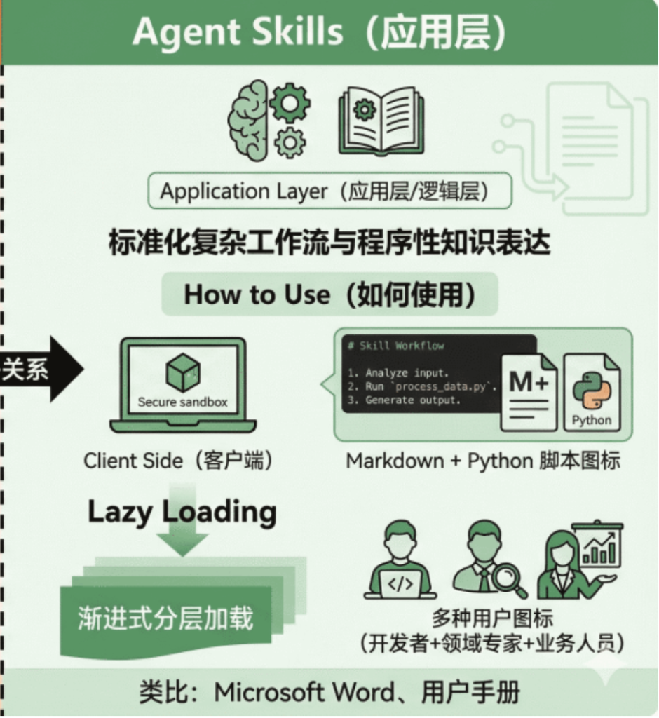 Agent Skills属于应用层,负责封装业务逻辑和领域知识,是智能体的“业务核心”。它基于MCP提供的接口,定义具体的任务执行流程,适配特定的业务场景。不同的技能可以调用同一个MCP服务器,实现不同的业务功能。这种职责分工,实现了业务逻辑与基础设施的解耦,提升了智能体的可维护性和复用性。