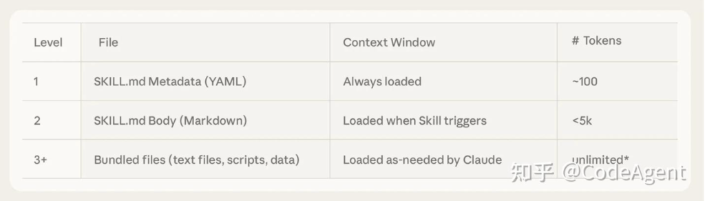 - 执行阶段:当 Skill 被选中时,完整内容和资源才会加载到上下文