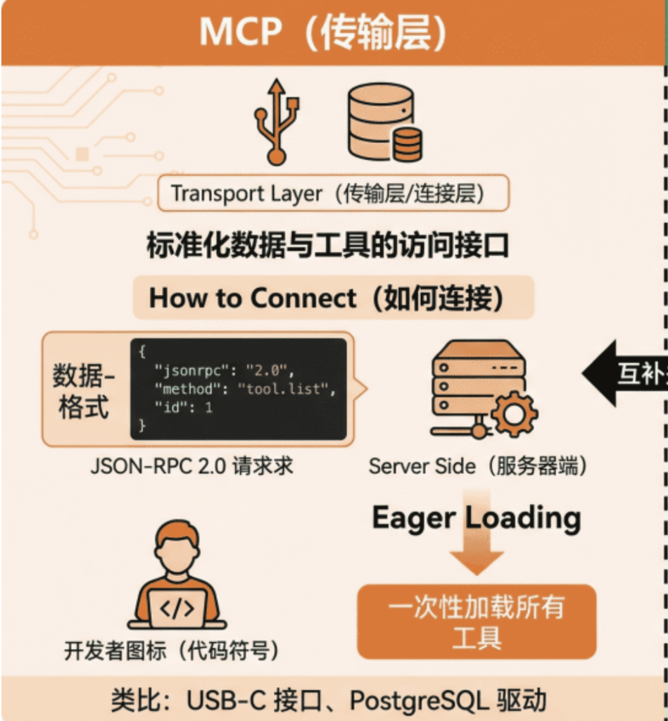 从架构层级来看,MCP属于传输层,负责智能体与外部工具的通信,是智能体的“基础设施”。它不涉及具体的业务逻辑,仅提供标准化的接口,确保数据传输的顺畅和稳定。同一个MCP服务器可以被多个技能复用,例如GitHub的MCP服务器,既可以被代码审查技能调用,也可以被代码合并技能调用。