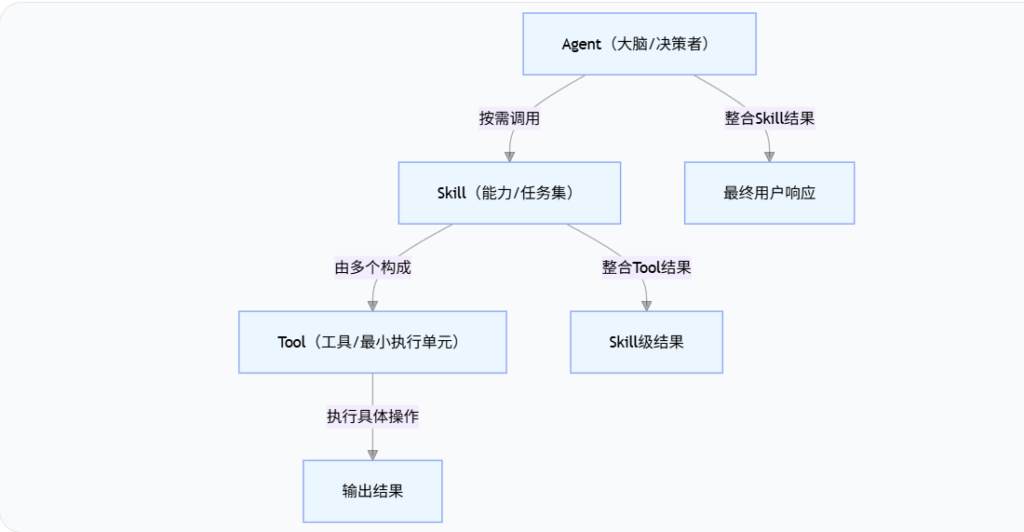- 核心逻辑:Tool 是原子操作,Skill 是业务能力封装,Agent 只调用 Skill 完成任务;