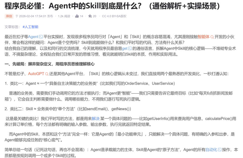 - 文章视角:把「Skill」直接等同于「最小可执行单元」,因为在 Agent 平台(如扣子、AutoGPT)里,Skill 就是你注册的一个个函数 / API,是 Agent 能直接调用的最小单位。