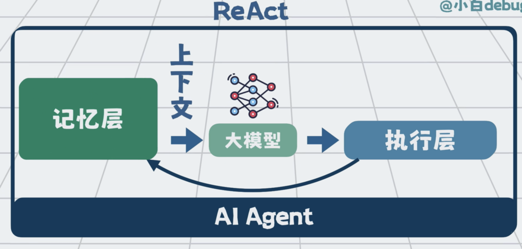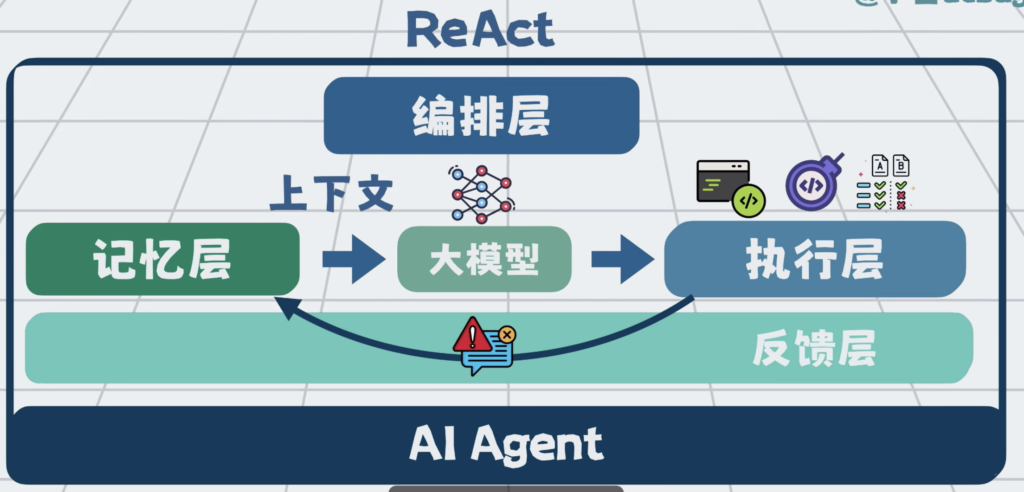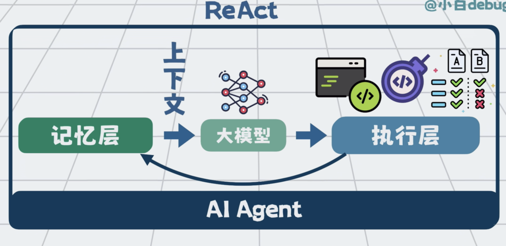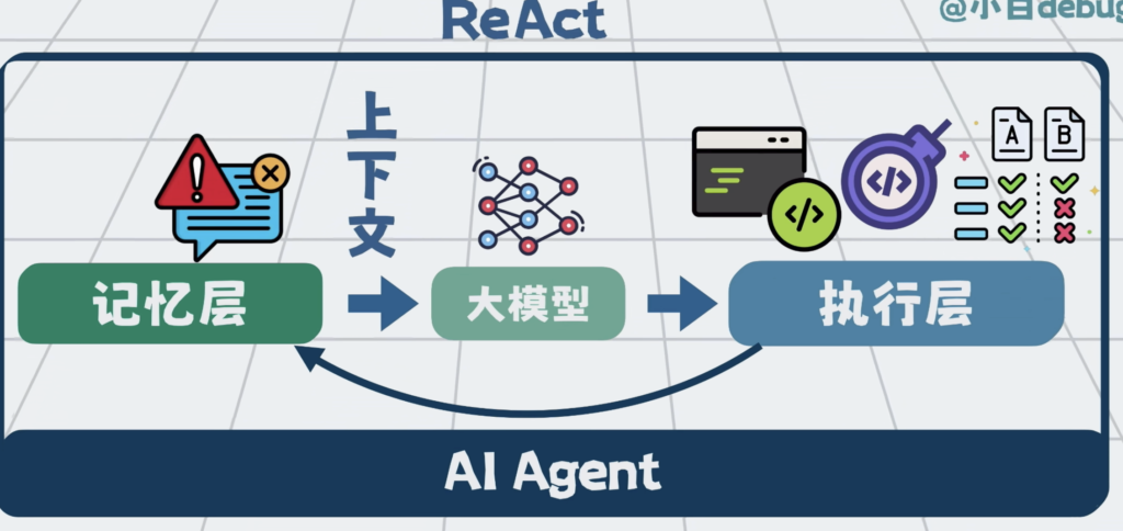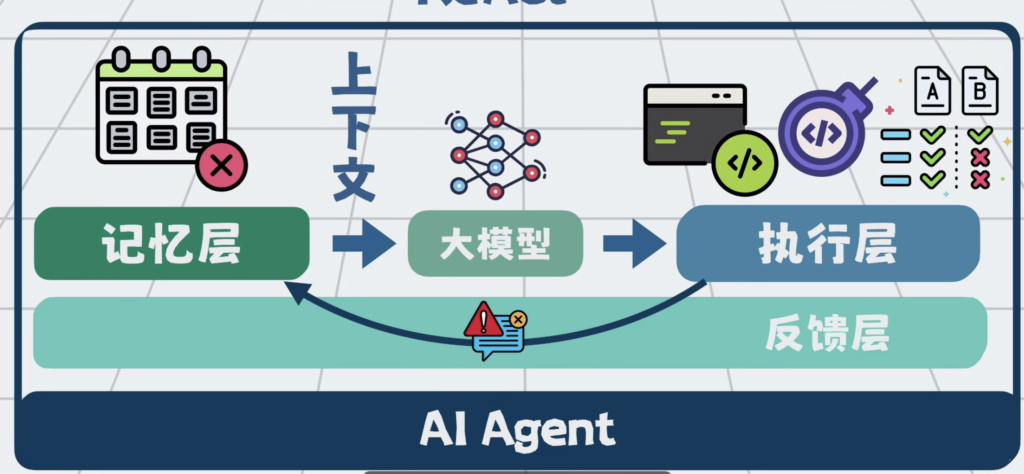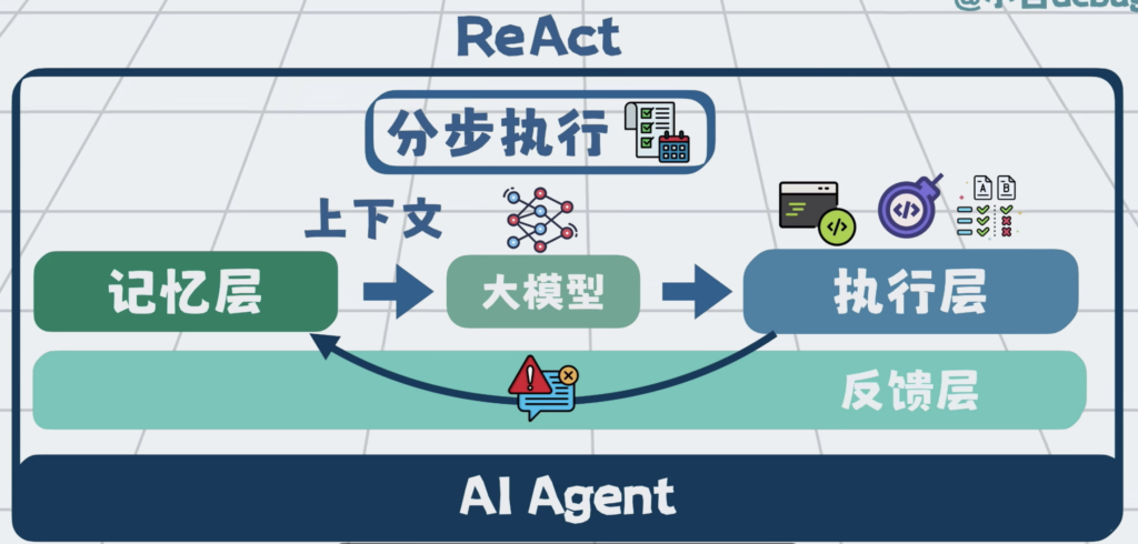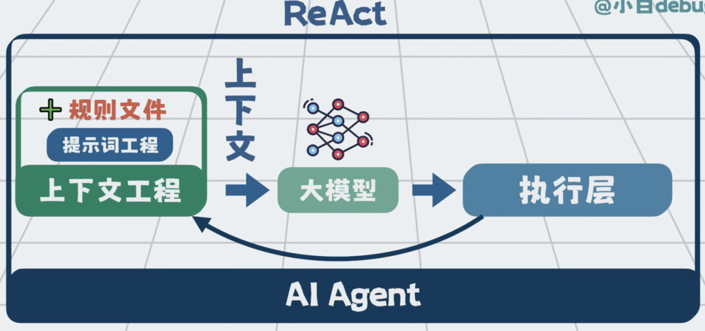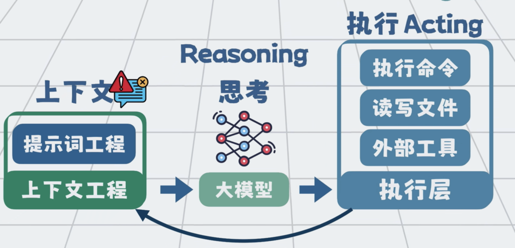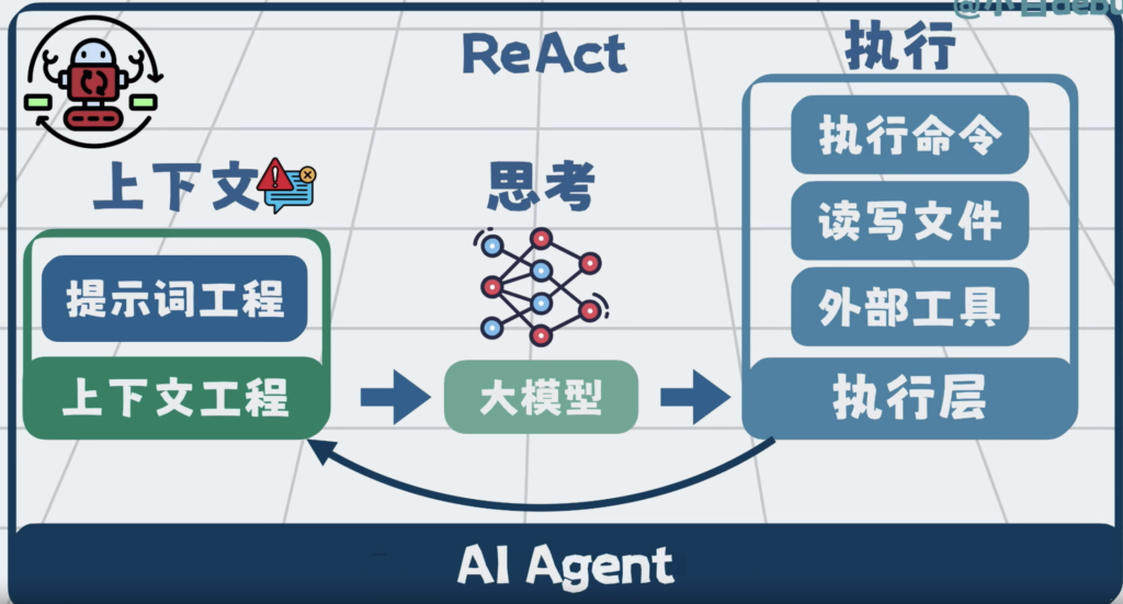 bash沙箱,文件系统,MCP 他们 共同构成了执行层,将他们串成一个流程,在外部套一层循环。于是我们就可以通过提示词工程和上下文工程,组装上下文,发给大模型,大模型负责思考,外部程序负责执行。执行过程中,得到的报错等信息,再加到上下文里,继续推理和执行。这套一边思考,一边行动的循环,就是所谓的ReAct。