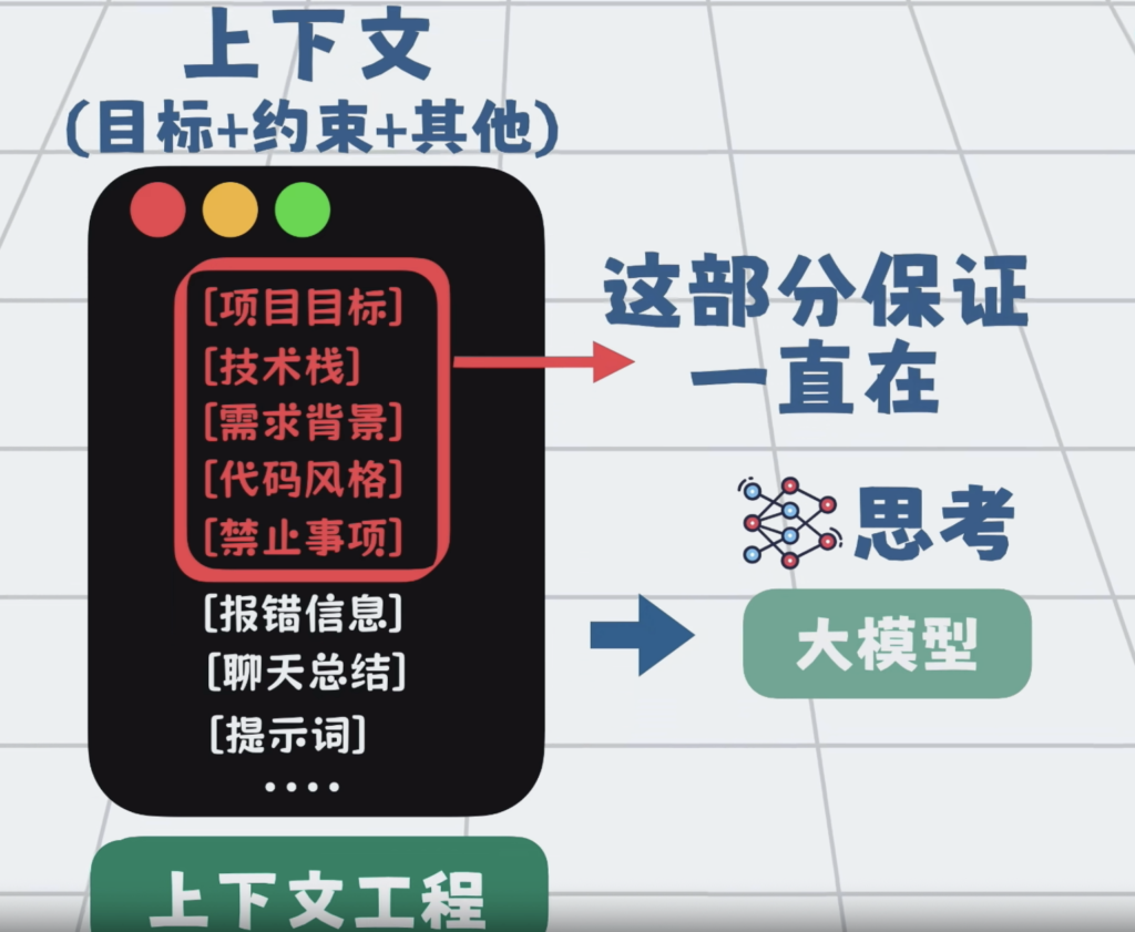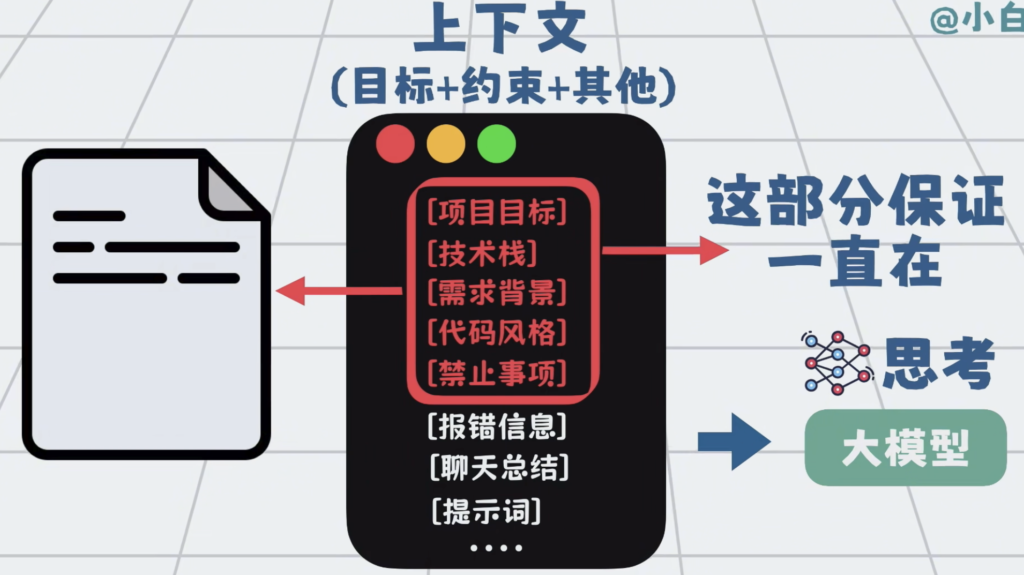 怎么办呢?很简单,只要我们可以保证每次给大模型的上下文中,都包含一些可复用的核心信息,比如项目目标,技术栈,需求背景,代码风格,禁止事项等。只要保证这部分一直在,那大模型就能在大框架约束下,减少理解偏移。