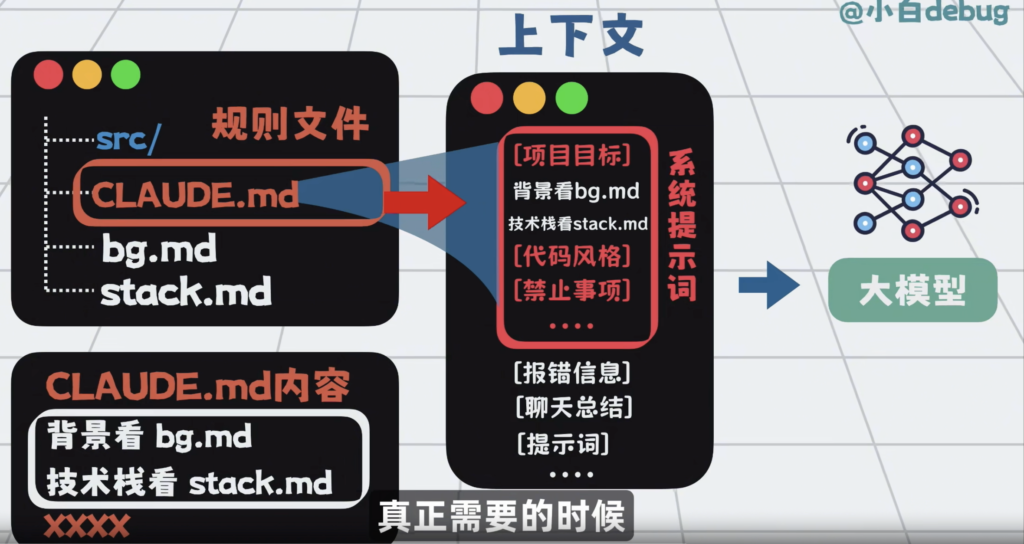 规则文件写多了也会变长,所以上下文也会很长,那就拆,把它拆成几份更短的文件,再加一个简单的路由,比如背景就读bg.md,技术栈就看stack.md,一般情况下只需要加载文件的地址路径,真正需要的时候,再加载文件的全部内容。