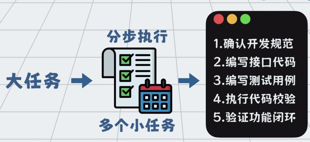 但Agent的循环,如果缺乏全局规划和清晰的结束目标,依然很容易跑偏,甚至陷入无效的死循环。所以我们还可以将大任务拆解为有明确执行标准的多个子任务,就像这样,按规划驱动Agent分步执行。