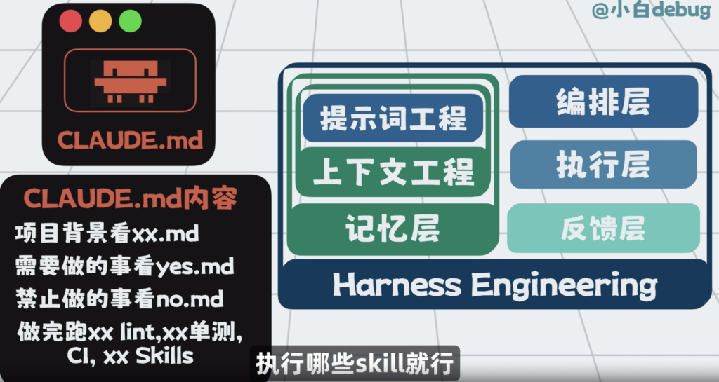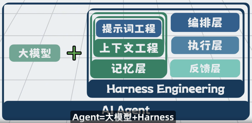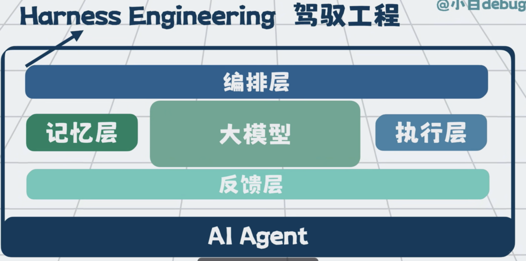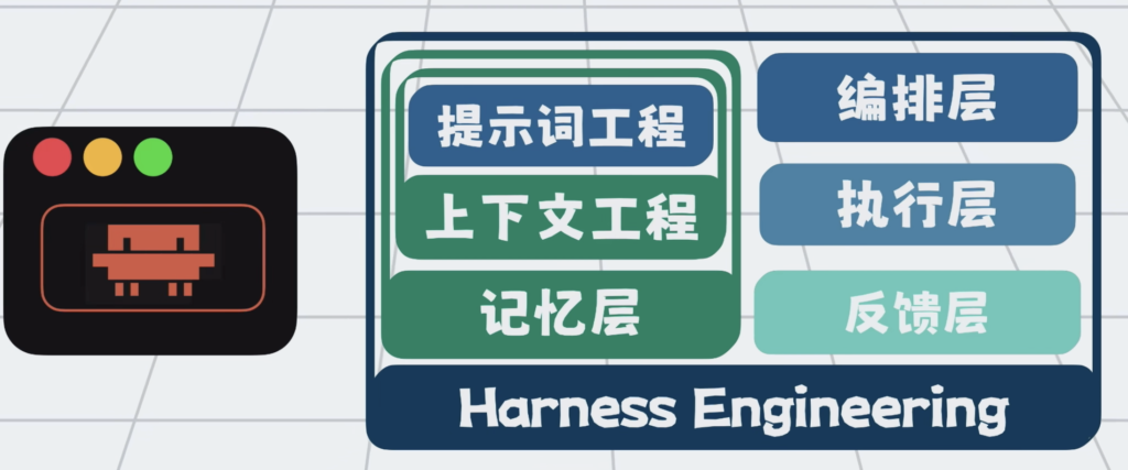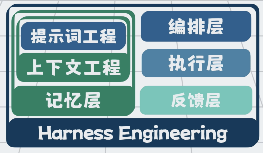 编排层,执行层,反馈层和记忆层,这些能力共同组成了一套,包裹着大模型的工程外壳,它就是Harness Engineering,驾驭工程。