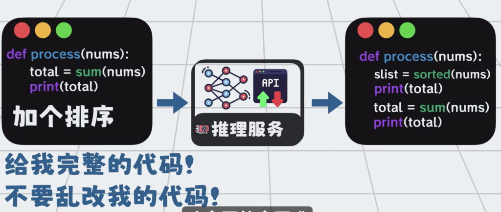 比如你丢给他一段代码,说【加个排序】,它可能只回你排序那部分怎么写。