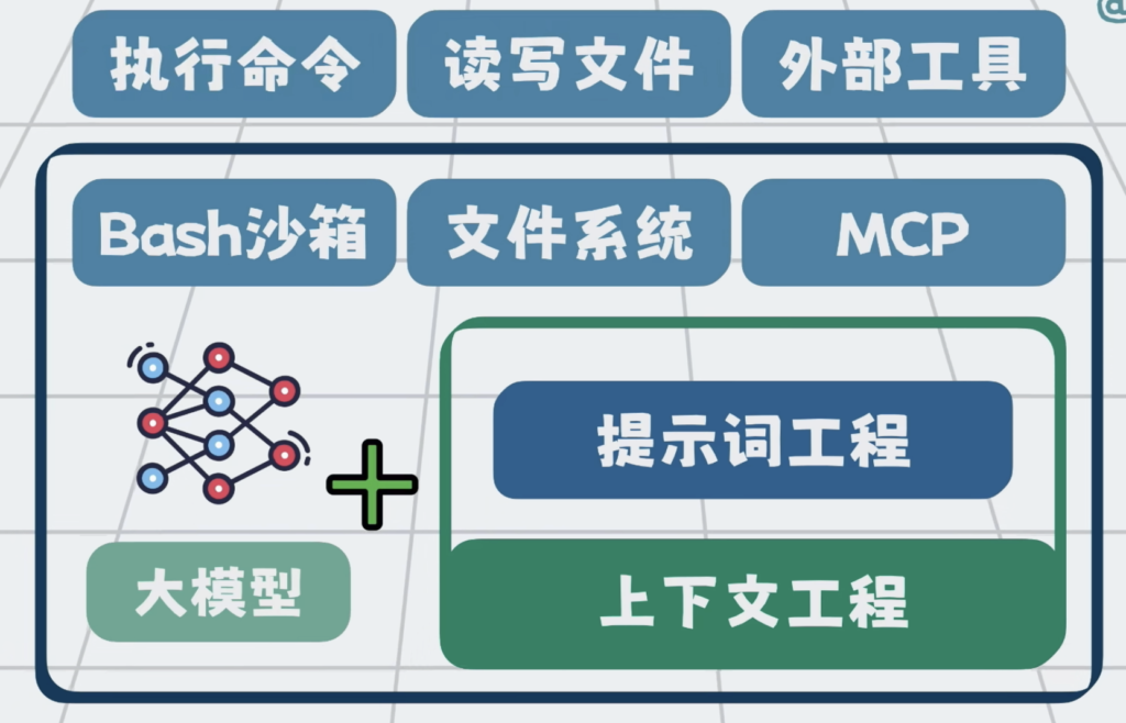 于是我们可以给大模型加入bash沙箱,文件系统,MCP这些能力,让它能像人一样操作外部工具,读写代码文件,执行命令做测试。